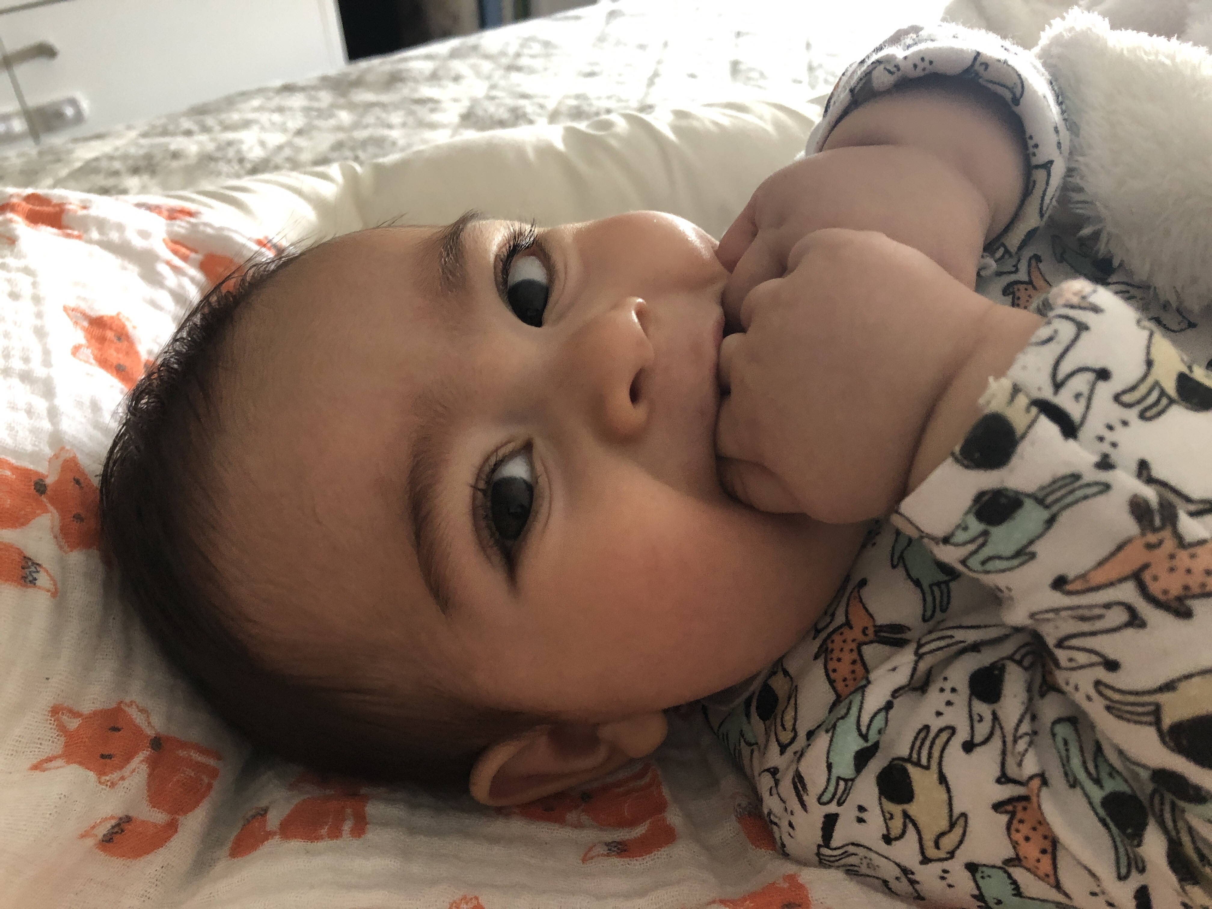Juntas tus manitos al medio rápidamente, cuando tomas un objeto lo llevas al centro y a la boca directo, te chupas los deditos con gusto y casi desesperación, a veces haces arcadas de tan adentro que te metes los dedos. Aún no visualizo la salida de algún diente, pero a veces pareces desesperado. La verdad es que ya tomas las cosas mucho más diestramente y las sostienes más tiempo, las miras y las sueltas las mueves y las chupas.